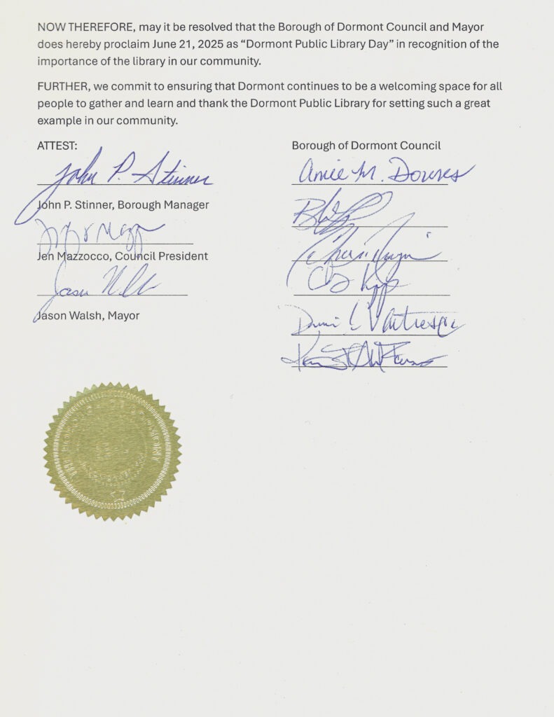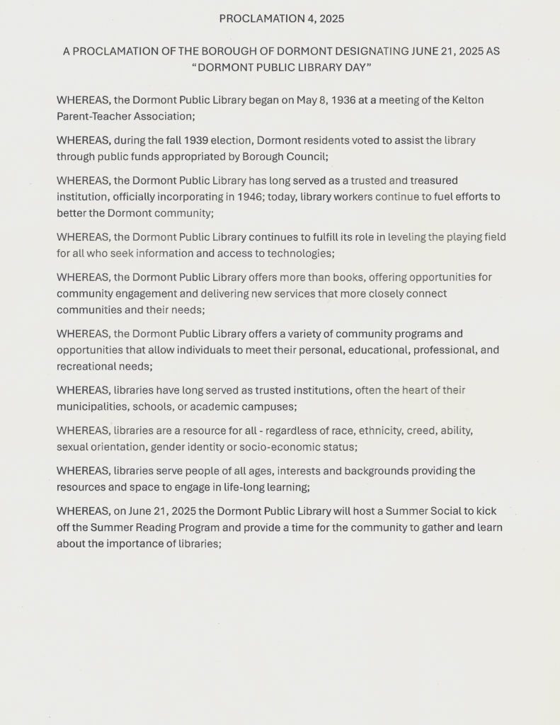 NOW THEREFORE, may it be resolved that the Borough of Dormont Council and Mayor does hereby proclaim June 21, 2025 as “Dormont Public Library Day” in recognition of the importance of the library in our community.